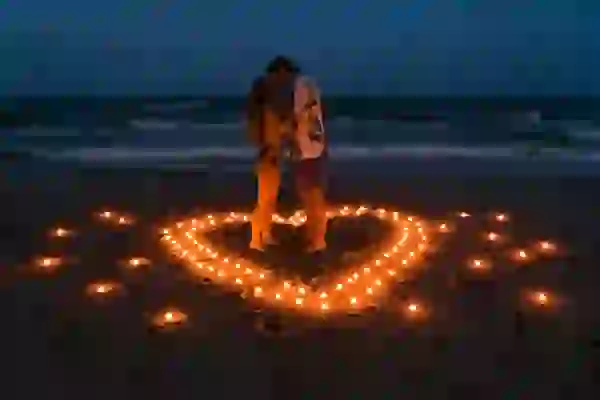 Create the perfect atmosphere with a romantic beachside setup, complete with rose petals and candles.